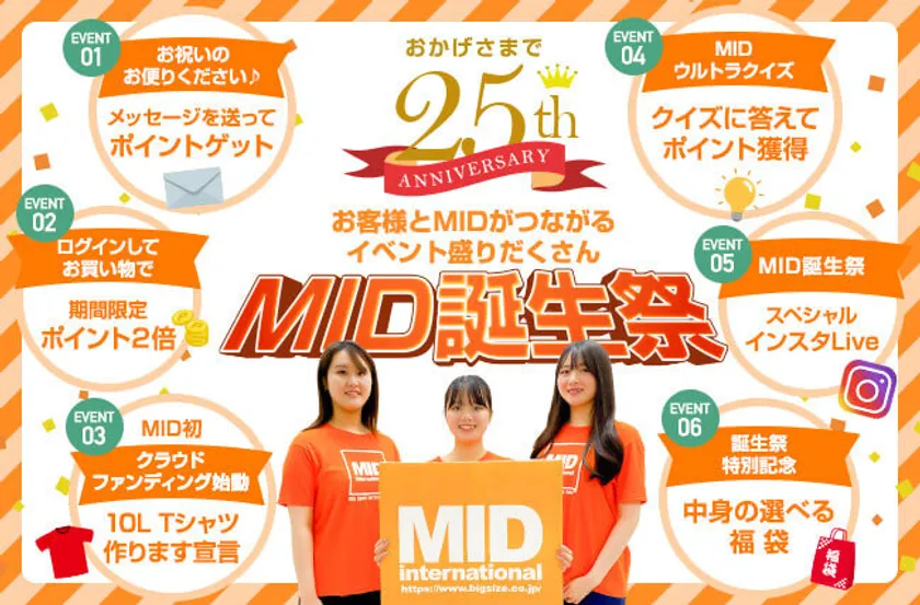 大きいサイズのメンズ服通販サイト「ミッド・インターナショナル」( https://www.bigsize.co.jp/ )を運営する株式会社ミッド・インターナショナル(本社:岐阜県岐阜市、代表取締役:宮崎 弘司)は25周年を記念し、10月12日(火)昼12時から「MID誕生祭」を開催いたします。