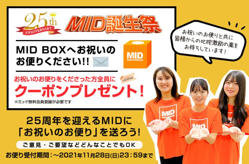 ミッド誕生祭24周年の際にも開催した「お祝いのお便りください」が今年も復活!昨年は多くのお客様より温かく時には厳しく、ミッド愛に溢れたお祝いメッセージをたくさんいただきました。ぜひ今年も25周年のお祝いのメッセージをミッドにたくさん送ってください!