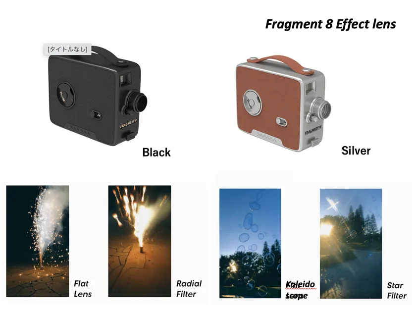 Fragment8は、60年代の8mmフィルムの特徴と現代のデジタル写真技術が組み合わさったデジタルトイカメラです。カメラの数字「8」は、1932年にコダック社が開発し、映画に広く使われた「8ミリフィルム」を表しています。8ミリフィルムの独特の色や不完全さが、見る人に懐かしさを感じさせます。