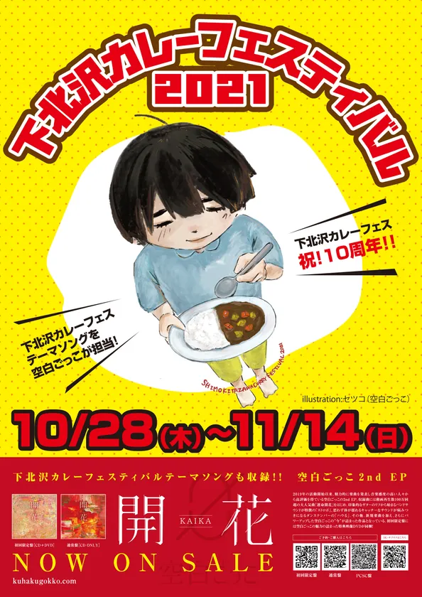 下北沢を拠点とし、主にインターネットミュージックシーンを中心に活動中の「空白ごっこ」が、10回目の開催を記念し下北沢カレーフェスティバルのテーマソングを作成!ポップな音楽で聴いたらみんなカレーを食べたくなりお腹が空く一曲になっています。また、スタンプラリーで21スタンプ集めるともらえる限定Tシャツのデザインをボーカルのセツコが担当。さらに参加店にはコラボ限定ポスターが掲示されているお店もあります。