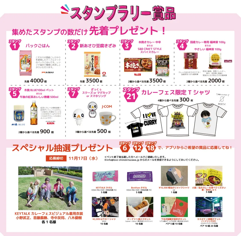 株式会社アイラブ(東京都世田谷区、代表取締役社長 西山友則、以下「アイラブ」)は、下北沢商店街連合会(会長 柏雅康)と、2021年10月28日(木)~11月14日(日)までの18日間、下北沢のオリジナルカレーが楽しめる「下北沢カレーフェスティバル2021」を開催します。開催に際し、下北沢を活動拠点とするロックバンド「KEYTALK」が、スペシャルアンバサダーに就任しましたのでお知らせします。