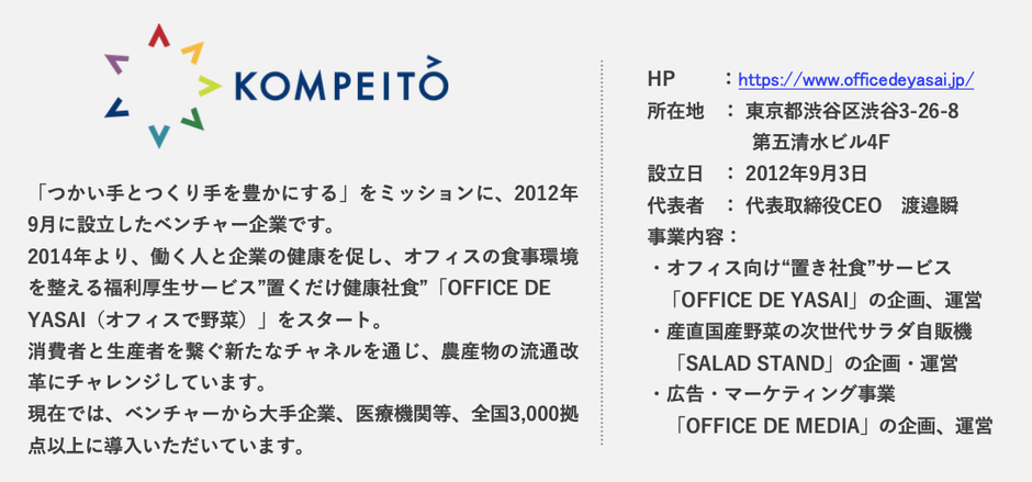 株式会社KOMPEITO(東京都渋谷区、代表取締役 渡邉瞬)が展開する“置くだけ健康社食”「OFFICE DE YASAI (オフィスで野菜)」は、全国の地方自治体や各地のJA 、JA全農と連携し、「OFFICE DE YASAI」専用冷蔵庫にて地方特産品の無料サンプリングや、専用アプリ「YASAI PAY(ヤサイペイ)」を通じて販売やアンケートを行う地方応援企画を月替りで実施しております。