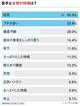 「今までに出会った女性で『苦手』『付き合うのは難しい』と感じた人の特徴は?」と聞いたところ、1位は「短気(55.9%)」 、2位は「グチが多い(53.4%)」という結果でした。どちらも50%超えで、B型男子の半数以上が「短気でグチが多い女性」のことを苦手と感じることが分かりました。気に入らないことに対してすぐに怒ったり文句を言ってしまう女性は、B型男子の前では特に注意が必要ですね。