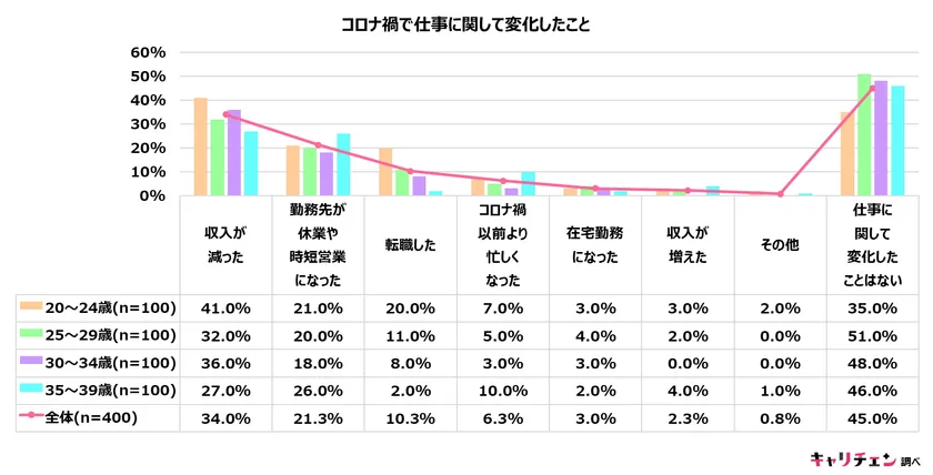 約3人に1人(34.0%)が「収入が減った」ことが判明。特に20~24歳においては「収入が減った」41.0%、「転職した」20.0%と多くの方に影響が。