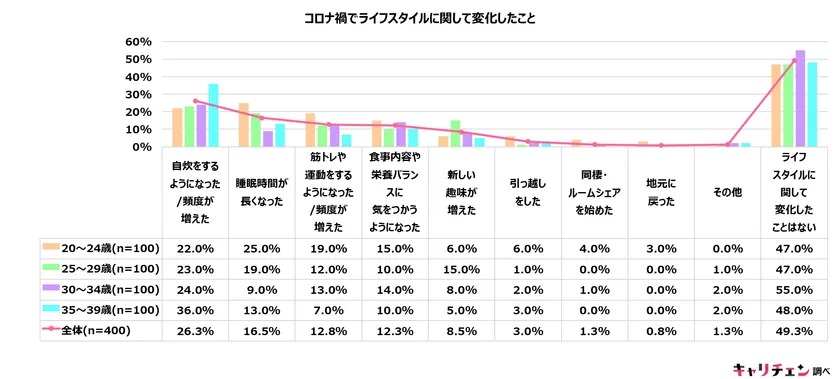 コロナ禍で“ライフスタイル”に関して変化したことをお聞きしたところ、Q1の“仕事”に関する変化同様、半数以上の50.7%の方が変化があったと回答しました。変化したことのTOP3は「自炊をするようになった/頻度が増えた」26.3%、「睡眠時間が長くなった」16.5%、「筋トレや運動をするようになった/頻度が増えた」12.8%となりました。