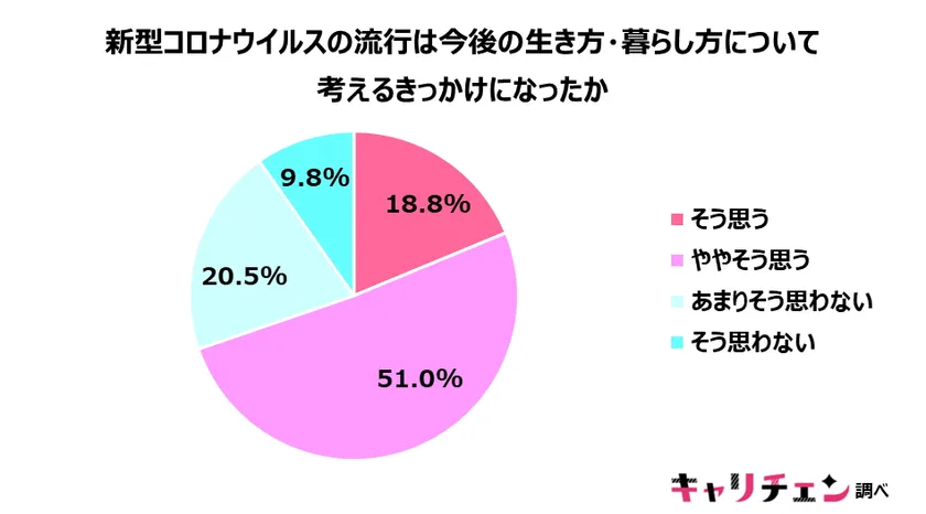 新型コロナウイルスの流行は今後の生き方や暮らし方について考えるきっかけになったかに対し、「そう思う」18.8%、「ややそう思う」51.0%と、約7割が新型コロナウイルスをきっかけにご自身の生き方・暮らし方について考えることがあったようです。