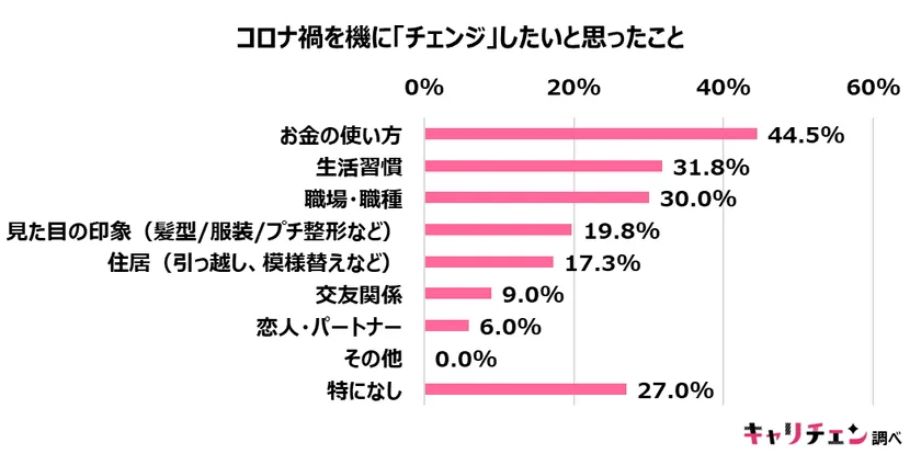 1位「お金の使い方」44.5%、2位「生活習慣」31.8%、3位「職場・職種」30.0%。「恋人・パートナー」をチェンジしたいと思った人も。
