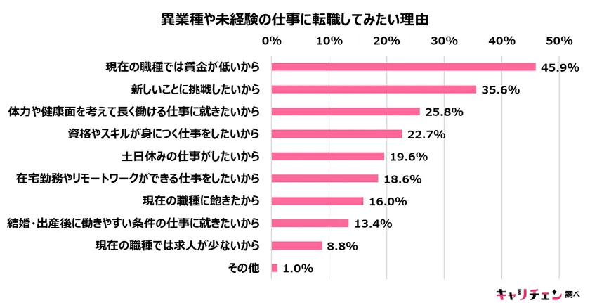 理由は「現在の職種では賃金が低いから」が最も多く45.9%、「新しいことにチャレンジしたいから」35.6%、「体力や健康面を考えて長く働ける仕事に就きたいから」25.8%と、収入面の改善以外に、変化に意欲的なことが判明。