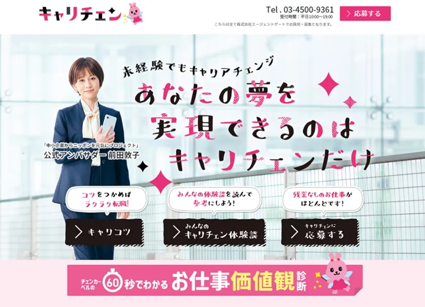 「キャリチェン」は未経験でも事務職にキャリアチェンジしたい女性の転職を支援するサービスです。「土日休みの仕事がしたい」「給料を上げたい」「接客業で将来が不安」「長時間労働で体力的につらい」などのお悩み・不安から、オフィスワークに転職したい方へ、お仕事を紹介するだけではなく「正社員」として採用します。スキルや経験がなくてもサポートがあるので安心。「キャリチェン」であなたの夢を実現します。