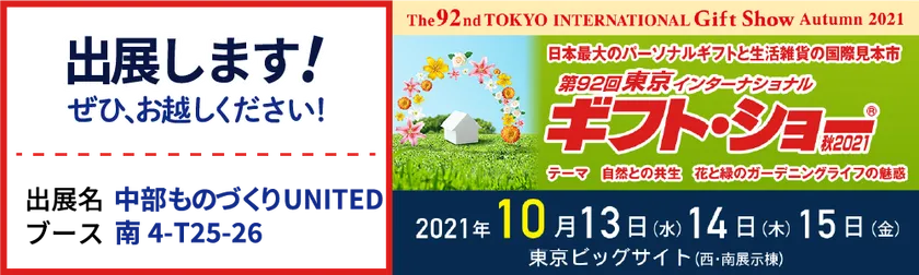 株式会社中村製作所(本社:三重県四日市、代表取締役:山添 卓也)、株式会社前田テクニカ(本社:三重県三重郡、代表取締役:前田 昌彦)、株式会社セイワ(本社:愛知県西尾市、代表取締役社長:加藤 正和)は2021年10月13日(水)~15日(金)、東京ビッグサイトで開催される日本最大級のパーソナルギフトと生活雑貨の国際見本市「第92回東京インターナショナル・ギフト・ショー秋2021」に3社で共同出展します。ブース名は「中部ものづくりUNITED」。町工場3社の金属加工技術を生かした、BtoC向け商品を展示いたします。また、商品開発のご相談も承ります。