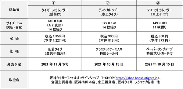 毎年、多くの阪神タイガースファンにご好評いただいております「阪神タイガースカレンダー((1)壁掛けタイプ・(2)卓上タイプ・(3)卓上タイプマスコット)2022年版(3種類)」を一般発売に先駆けて、2021年10月8日(金) から、阪神タイガース公式オンラインショップT-SHOP( https://shop.hanshintigers.jp/ )及び阪神タイガースカレンダー事務局( http://hcl-sportsshop.com/ )において予約受付を開始いたします。