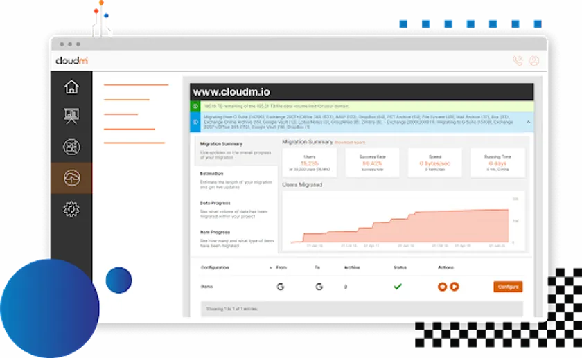 CloudM はSaaS型のサービスとして提供される、マネージドデータ移行ツールです。世界107カ国4万以上の組織で利用され、6,500万回以上の移行実績のあるツールです。オンプレミスファイルサーバーや Box 、Microsoft 365 など、幅広い移行元に対応しております。メールやカレンダー、ファイルのデータを Google Workspace へ移行します。移行後は、IT管理プラットフォームとして、IDライフサイクル管理や電子メールの署名管理、データアーカイブ等で継続的に利用可能です。