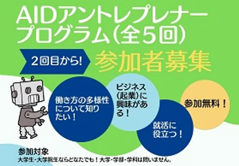AAI起業部が主催する、学生による、学生のための全5回の起業講座です。対象は愛知県内の大学に在籍する大学・大学生で、受講料は無料。AAI起業部のアドバイザーに学び舎mom代表の矢上 清乃が就任しました。