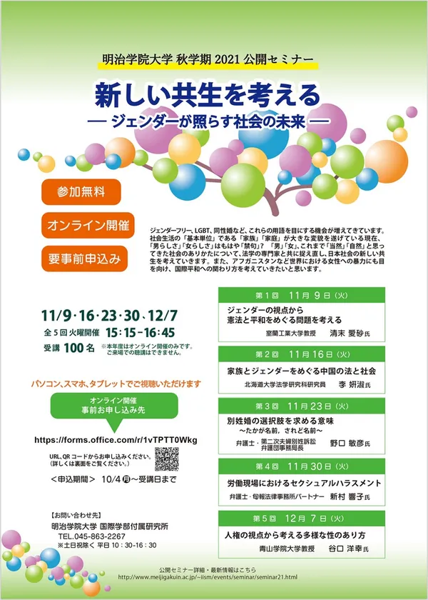 明治学院大学国際学部付属研究所が無料オンラインセミナー 「新しい共生を考える ―ジェンダーが照らす社会の未来―」を 11月・12月に開催(全5回)