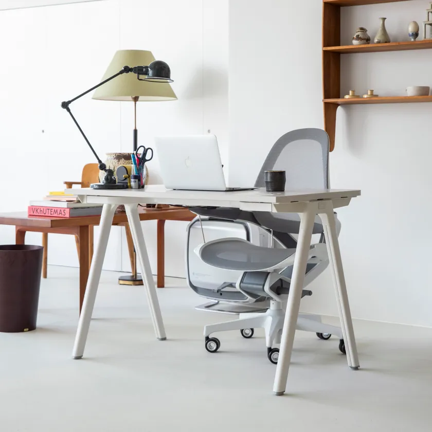 明るく清潔感のあるホワイトを基調に、Aライン脚が軽やかな印象を与えるワークデスク。空間を選ばないシンプルなデザインが、オフィスやご自宅のインテリアになじみます。