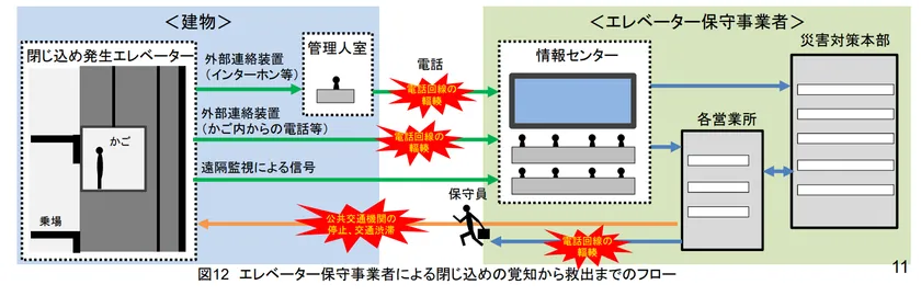 国土交通省「エレベーターの地震対策の取組みについて」によると、2018年に大阪北部で起きた最大震度6の地震で、停止したエレベーターで発生した閉じ込めの救出に3時間以上かかった件の原因として、作業員の到着遅れと情報伝達遅れが挙げられています。通常フローでは、建物の管理人・保守事業者の情報センター・災害対策本部・各営業所等、多くの段階を経て作業員へ情報が届くため、電話回線の輻輳や交通渋滞などが現場到着への大きな障害となっています。