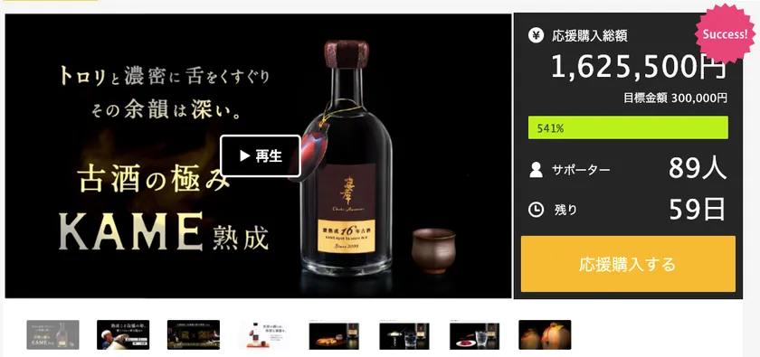 その第一弾として10/10(日)クラファンサイトMakuakeで『貯蔵1.08%、古酒の極み。トロリと濃醇な秘蔵甕熟成16年古酒泡盛』を公開。開始2日で目標金額の541%である1,625,500円を達成致しました。