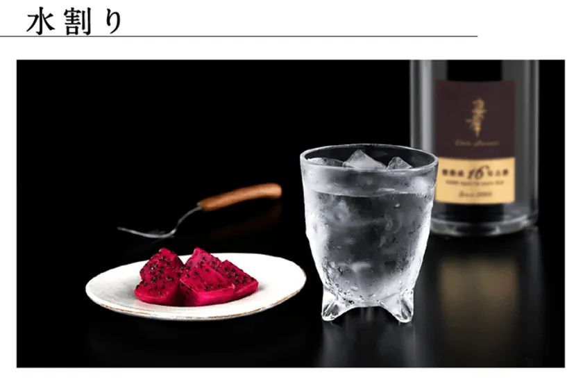 甕熟成古酒だと少しもったいなく感じるかもしれないが、おすすめの楽しみ方。まずは、水と1:1の割合で。琉球ガラスで、南国感をプラスする楽しみも。