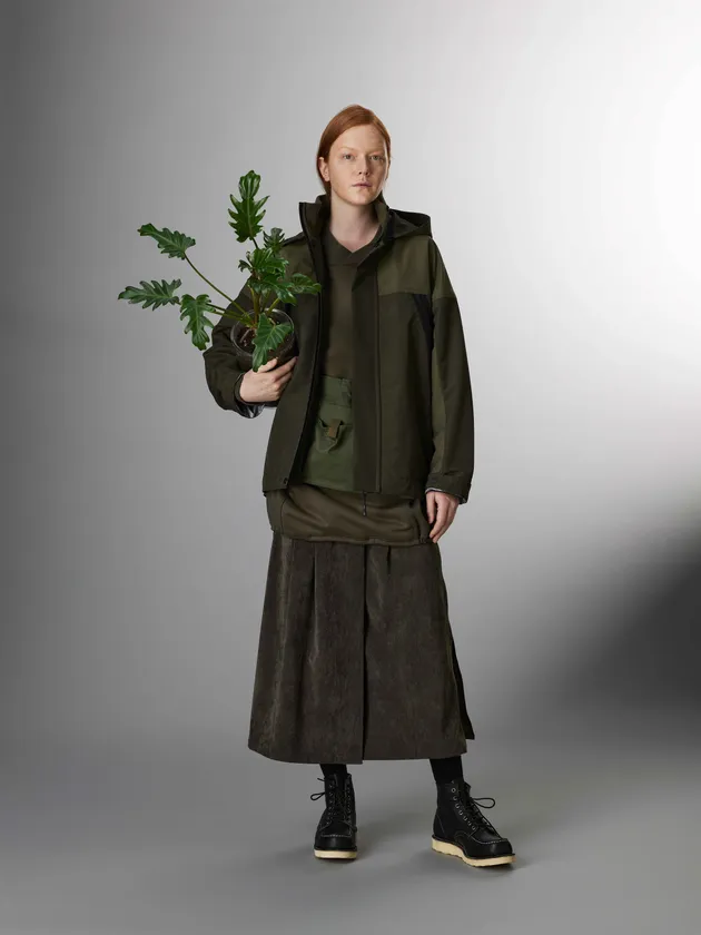 サングラスやシャベル、ペットボトルなど、ガーデニング時に使用するアイテムが多数収納できるミニエプロンは、アウターの背中部分に脱着可能。ATSURO TAYAMAのアイテムと合わせてコーディネートすれば、タウンでも着られる洗練したデザインになっています。