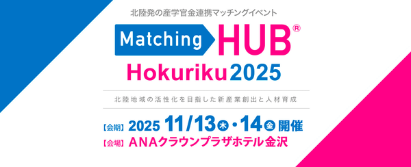 「Matching HUB Kanazawa・Hokuriku」は、「北陸地域の活性化を目指した新産業創出と人材育成」をビジョンに掲げ、北陸発の産学官金連携マッチングイベントとして、2014年度からスタートし、今年度は12回目の開催となります。