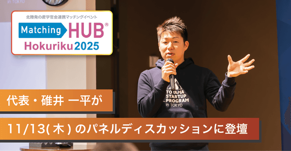 そしてこの度、『Matching HUB Hokuriku 2025』へのブース出展&代表・碓井がパネルディスカッションに登壇することとなりました。パネルディスカッションでは、『地域の未来に挑戦!~共創による持続的発展へのアプローチ~』をテーマに、富山という地域に根ざして挑戦をしているスタートアップの目線でお話しします。