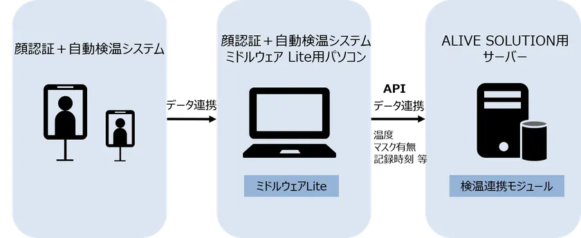「顔認証+自動検温システム」からの検温データを、APIを利用して「ALIVE SOLUTION TA」にシームレスに連携します。