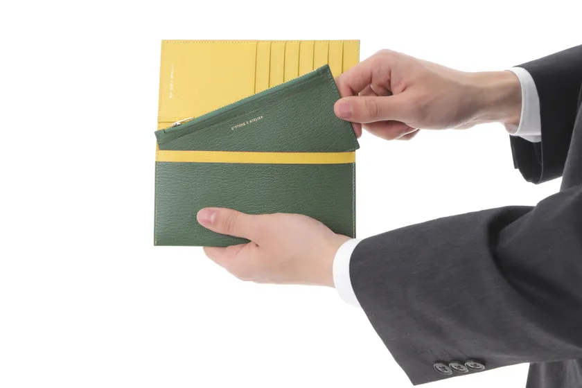セパレート型ウォレットは、見た目よりも大容量(お札20枚・カード10枚・小銭入れも十分収納)。