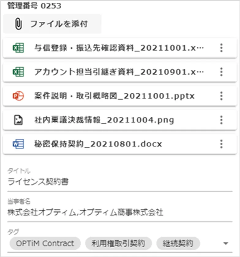 今回の機能追加によって、従来の紙媒体の契約書のスキャンデータやMicrosoft Wordで保存される契約書だけではなく、Microsoft PowerPoint・Microsoft Excel等で作成された資料をはじめとした、契約書の内容を補足説明するさまざまな関連資料ファイルを集約して管理可能となります。契約書そのもののデータに限らず契約にまつわる情報の拡散を防ぎ、契約情報の引継ぎ・内容の見直しなどのシーンにおいて情報伝達の効率化をもたらし情報捜索のコストや契約履行漏れリスクの削減をいたします。