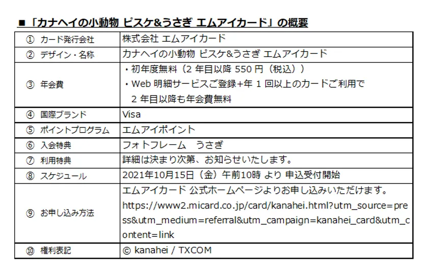 株式会社三越伊勢丹ホールディングス(本社:東京都新宿区、取締役 代表執行役社長 CEO:細谷 敏幸)の子会社である、株式会社 エムアイカード(本社:東京都中央区、代表取締役社長執行役員:梅田 貴生)は、株式会社テレビ東京コミュニケーションズ(本社:東京都港区、代表取締役社長:佐々木 宣幸)とクレジットカードの発行について提携し、「カナヘイの小動物 ピスケ&うさぎ エムアイカード」の申込受付を2021年10月15日(金)より開始いたします。
