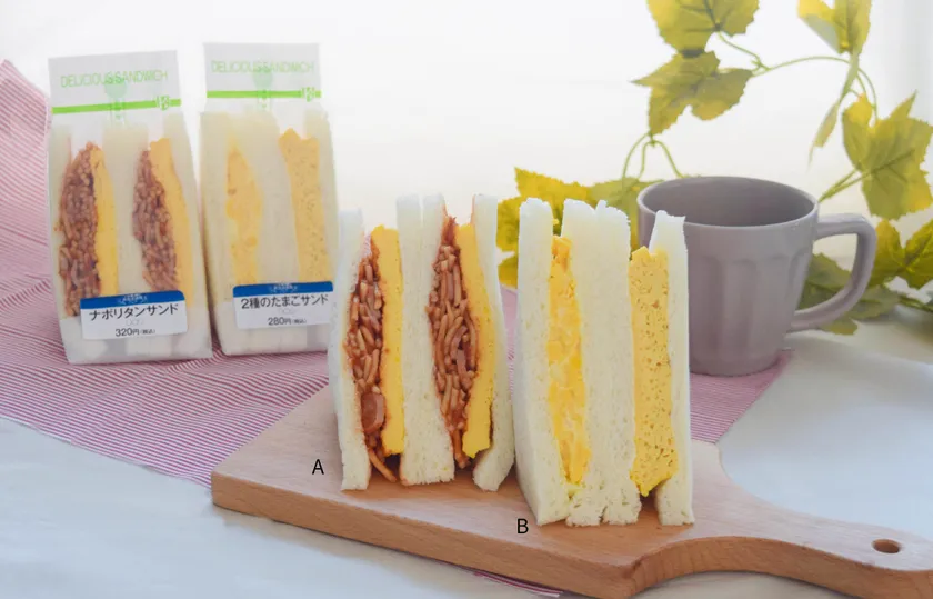 関東と関西の玉子焼きの味の違いに着目し、開発しました。甘く濃いめに味付けをした「関東風」、昆布だしをベースに味付けをした「関西風」の2種類の玉子焼きを味わえるサンドイッチです。