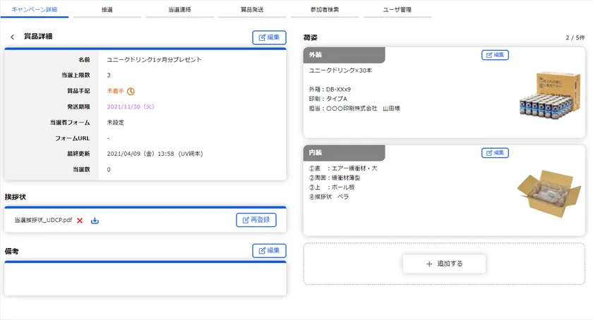 賞品は予め当選数を登録しておくことで、決められた数以上の当選連絡をできないように制御されています。また、各賞品の荷姿(外箱の様子、箱の中身、挨拶状)を画像や動画、ドキュメントで管理することが可能です。