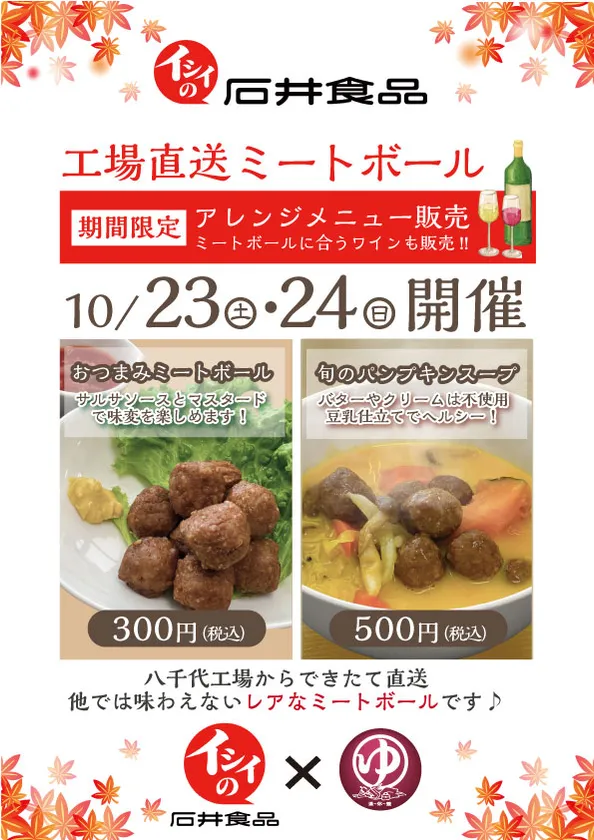 コラボレーションメニューには、石井食品の直営店・通信販売のみの限定商品である工場直送ミートボールを使用し、クリームやバターを使用せず豆乳を用いたパンプキンスープとサルサソースとマスタードでの味変が面白いおつまみミートボールの2種類をご用意いたします。