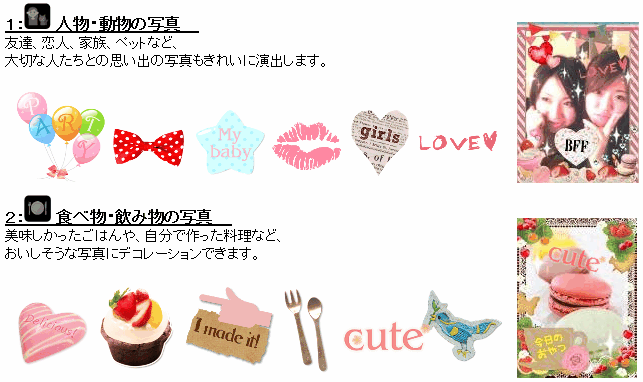 スマートフォン版デコメサイト「デココレ」の会員サービスとしてすでに提供中の「フォトデコ!」内でも人気の機能で、保存してあるデコメをスタンプとしてデコレーションできる「MYデコスタンプ」をphotodecoにも搭載しました。