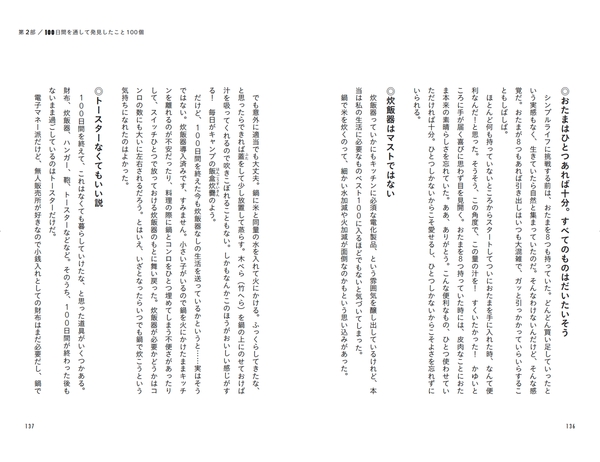 この生活を始めるまでは「なぜかおたまだけで8つも持っていた」という、シンプルライフとはほど遠い日々を過ごしていた著者が、何もない部屋に住み、本当に必要に迫られたものだけを1日1つずつ足していくという生活の中で、モノの本質やその価値、暮らしについてなど、それまでの固定観念を取り払って考えを深めていきます。