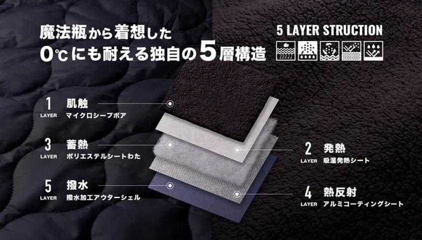 (1) 電源不要 “熱をつくり・熱をためる” 独自の5層構造で気温0℃でも暖かさが持続