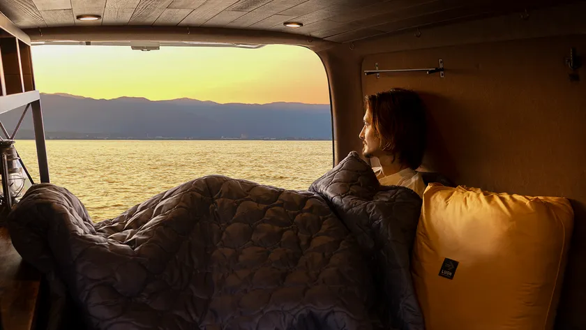 魔法瓶ブランケットLUGHは「熱をつくり・熱をためる」魔法瓶から着想を得た独自の5層構造で、包まった瞬間から暖かい、車中泊のためのブランケットです。