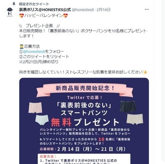 家族みんなを幸せにする、裏表前後/裏表のないスマート肌着「HONESTIES(オネスティーズ)」ブランドを製造・販売し、TVでも話題/2020年のグッドデザイン賞も受賞した大阪泉州発のD2CスタートアップHONESTIES株式会社(代表取締役社長 西出喜代彦)が、クラウドファンディングで多くのご支援をいただいた「裏表前後のないスマートパンツ」の本格販売開始を記念し、Twitterにてバレンタインプレゼントキャンペーン企画を行います。