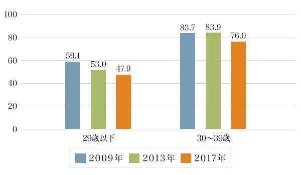 一家に一台のマイカーが当たり前だった時代、マンションは1住戸当たり駐車場1区画で設計されていました。しかし、現在は下図の自動車普及率の推移の通り29歳以下の世代および30~39歳の世代のどちらも徐々にではありますがクルマを所有しなくなってきています。クルマの所有をしない背景として経済的な理由やレンタカー・カーシェアリング市場が拡大してきたことが考えられます。