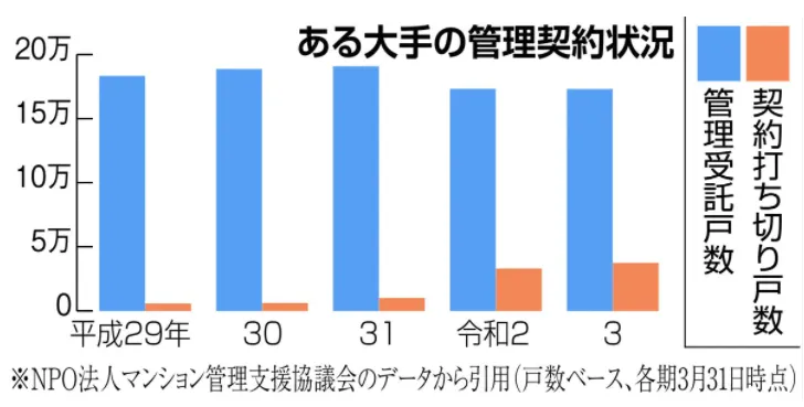 ”マンション業界の調査やコンサル業務などを行うNPO法人「マンション管理支援協議会」(東京)によると、ある大手管理会社において、今年3月末までの1年間で契約打ち切りとなった件数は、戸数ベースで3万7千戸を超え、4年前の6・6倍に伸びた。”