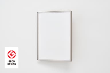 側面から飛び出す厚さ1mmの薄いアルミ板の縁が空間に緊張感を与えるシャープな額縁。卓上に平置きして細い縁の内側にアクリルカバーを被せれば、絵画や写真などの平面作品だけでなく立体的な作品を飾ることも出来る。使い方のフレキシビリティとアルミらしい素材感を生かしたディテールなどが評価された。