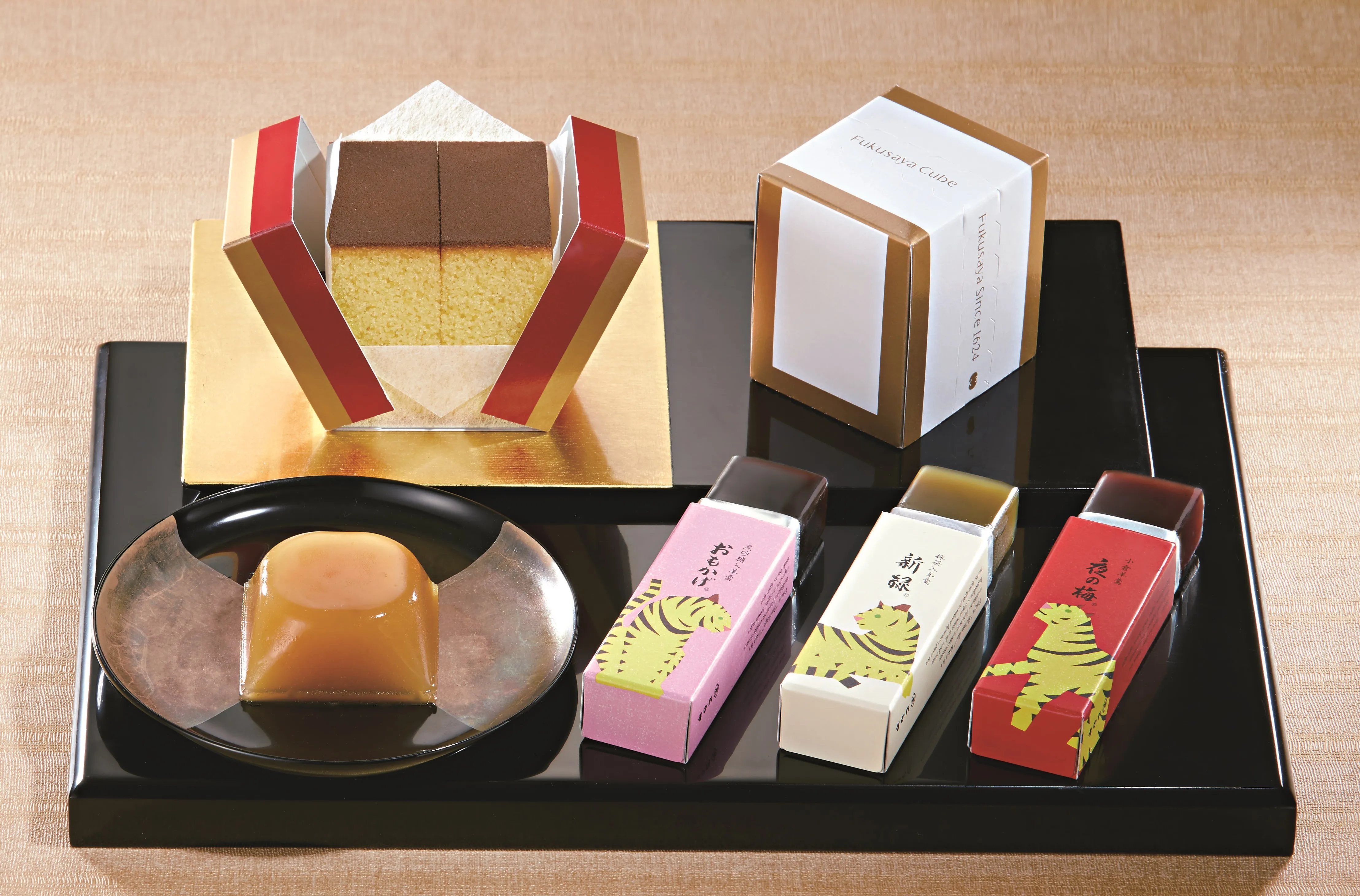 職人が手づくりした伝統のカステラを、おしゃれな小箱に詰めたフクサヤキューブ。伝統の味はそのままに、干支パッケージの小形羊羹や季節の煉菓子。菓子職人の技が光る老舗の銘菓を詰め合わせました。