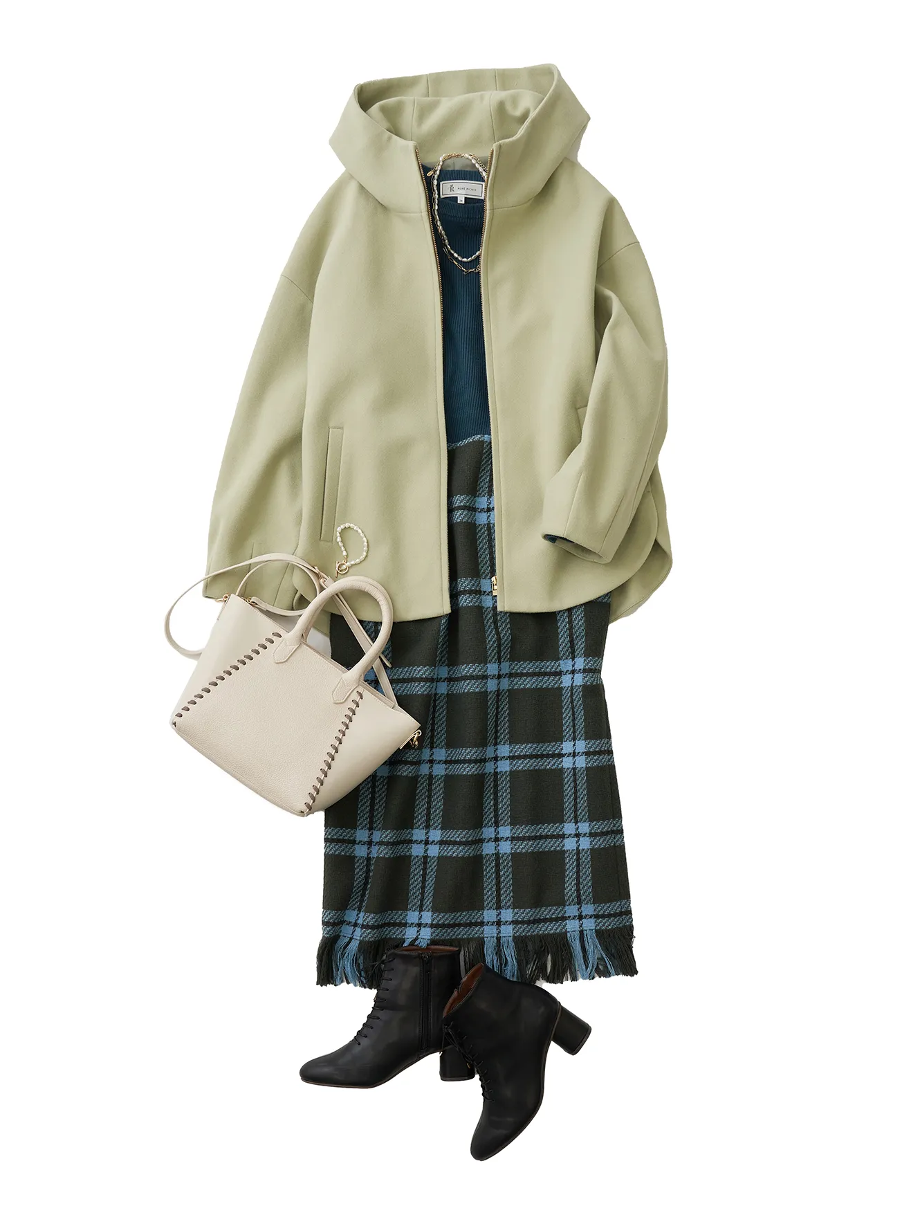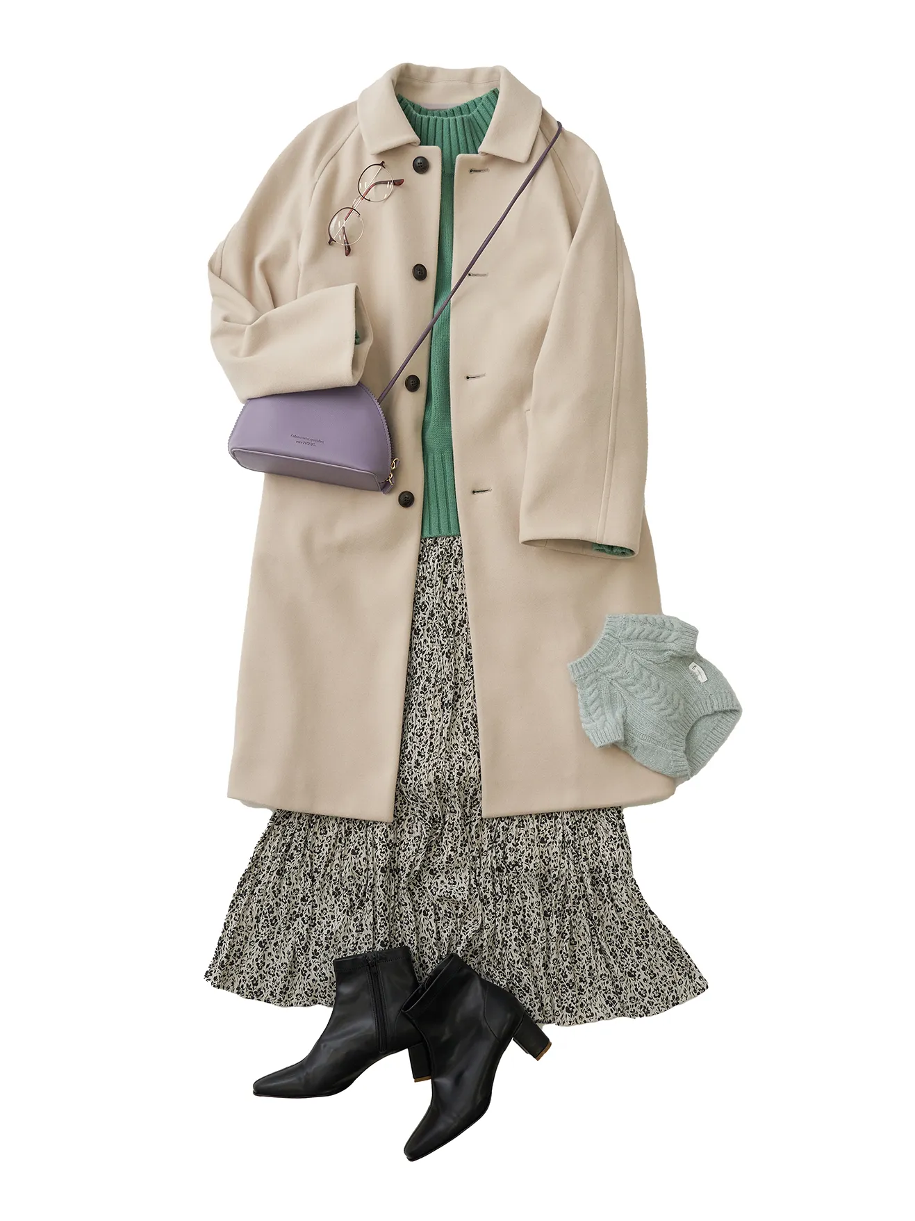 今年はコクーンシルエットのコートが気分。全身グリーン違いでまとめた今年らしいコーデ。