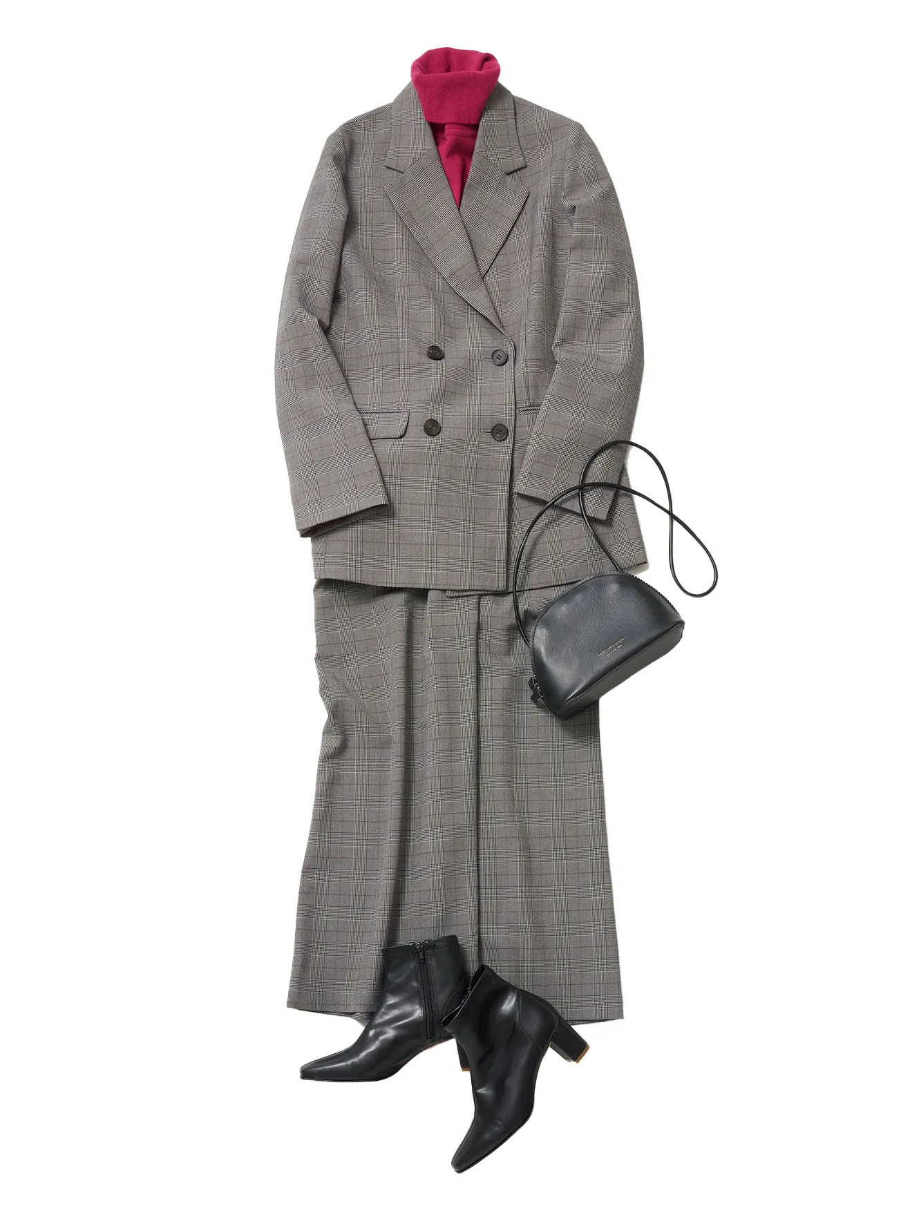 トレンドのチェック柄セットアップ。インナーには赤を効かせてレディライクに仕上げて。