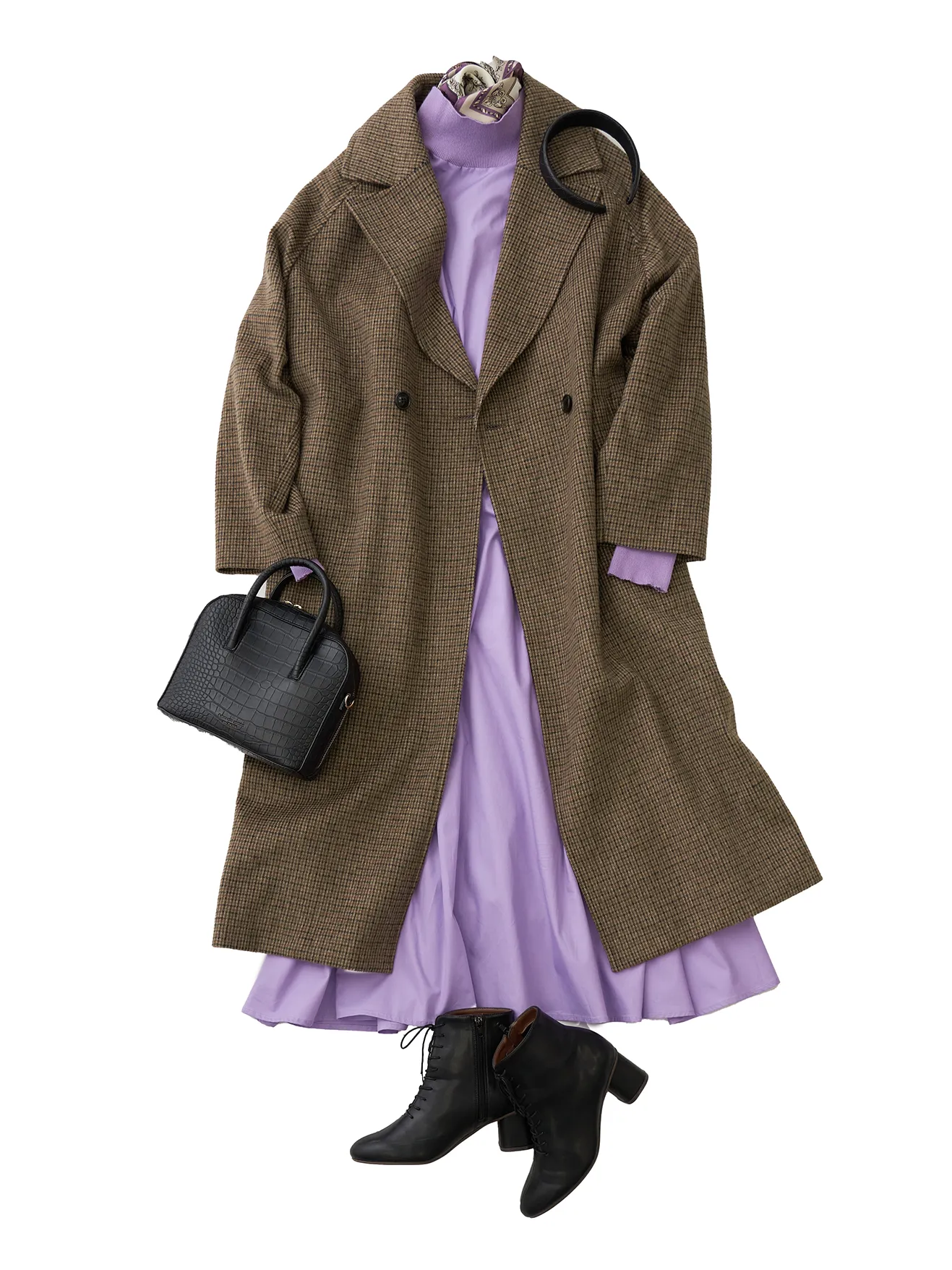 1枚でお洒落が完成するニットワンピースにはオーバーサイズのチェスターコートをサラっと羽織って。簡単におしゃれなお出かけスタイルの完成。