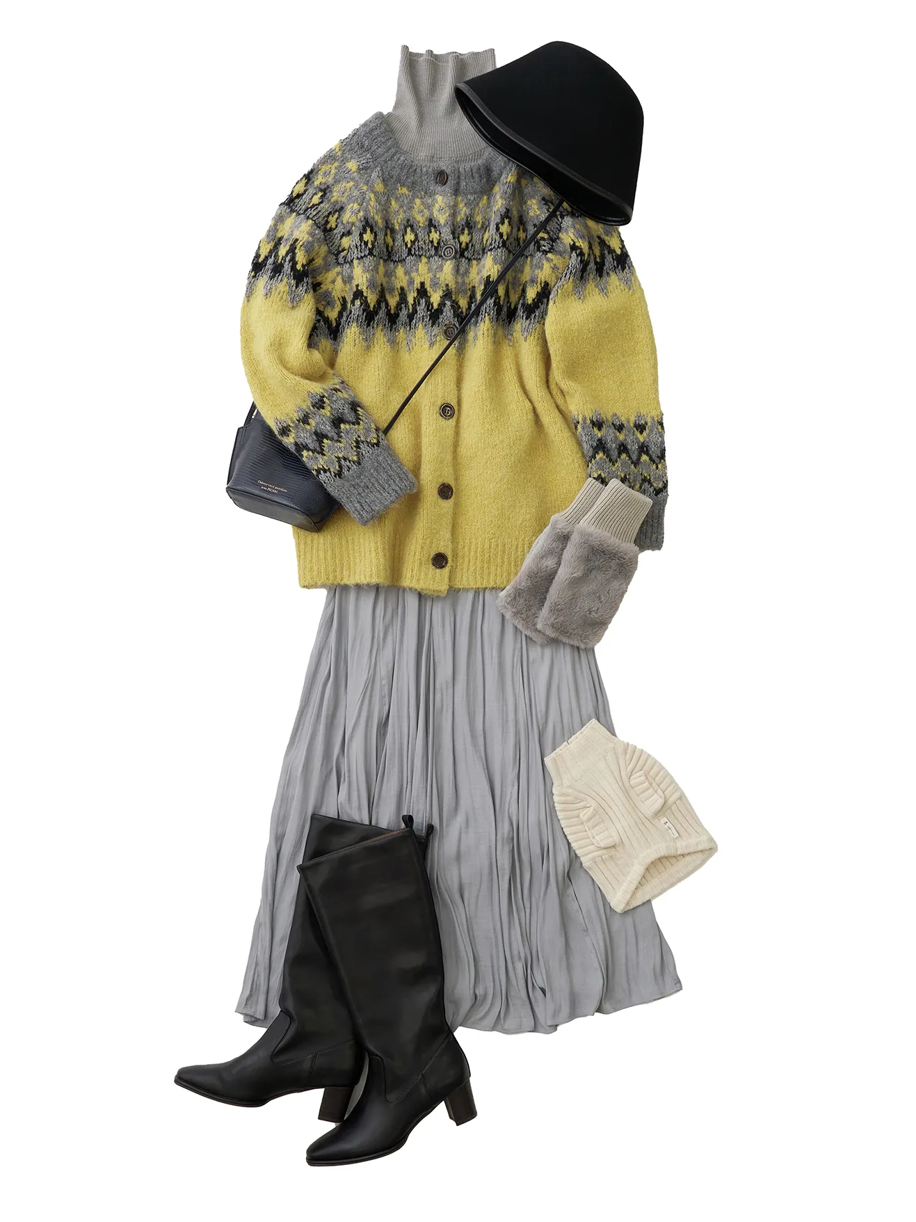 ざっくりオーバーサイズのノルディック柄のニットトップスを合わせた休日のお買い物コーデ。ロングスカートとブーツで大人もチャレンジできる、カジュアルスタイルの完成。