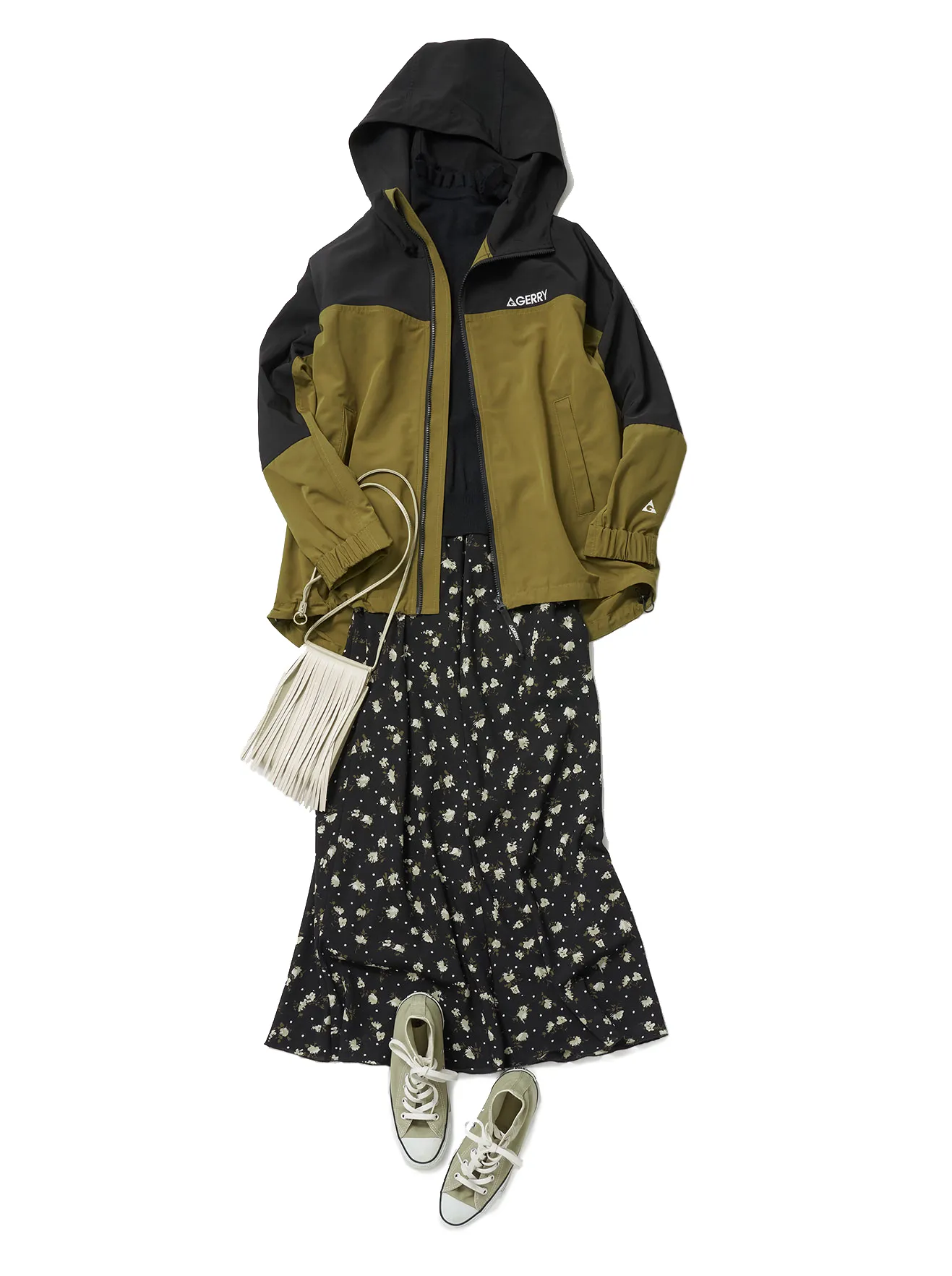 アクティブな雰囲気のアウターにはレディライクなスカートを合わせるのが今年らしい。