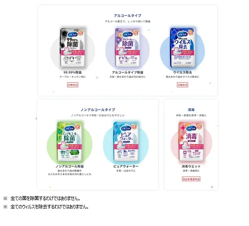 シルコットウェットティッシュ本体は、全6種類。用途に合わせて選べるラインナップを取り揃えています。