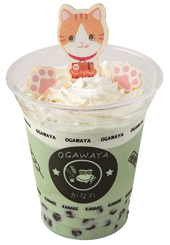 ドリンクは抹茶、ミルクティー、マンゴーの3種を用意(写真は抹茶)。たっぷりのホイップクリームともちもちの食感が楽しいタピオカドリンク。にっこり手を振るにゃらんと一緒なら、温泉街散策もおいしくハッピーになりそう。