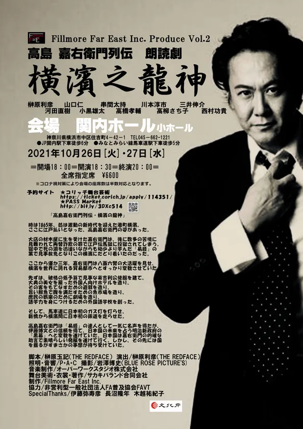 株式会社フィルモアファーイースト(本社所在地:東京都品川区、代表取締役:早川洋二)は、芸能活動33周年を迎えた榊原利彦主演の朗読劇『高島嘉右衛門列伝 横濱之龍神』が、横浜関内ホール・小ホールで、2021年10月26日、27日に開催されることをお知らせします。