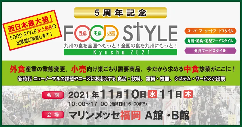 FOOD STYLE Kyushu 実行委員会(所在:東京都港区、運営:株式会社イノベント)は、11月10日(水)・11日(木)の2日間、マリンメッセ福岡A館・B館にて「九州の食を全国へもっと!全国の食を九州にもっと!」をコンセプトとした食の商談展示会『FOOD STYLE Kyushu 2021』(スーパーマーケットフードスタイル、弁当・給食・宅配フードスタイル、外食フードスタイル)を開催いたします。